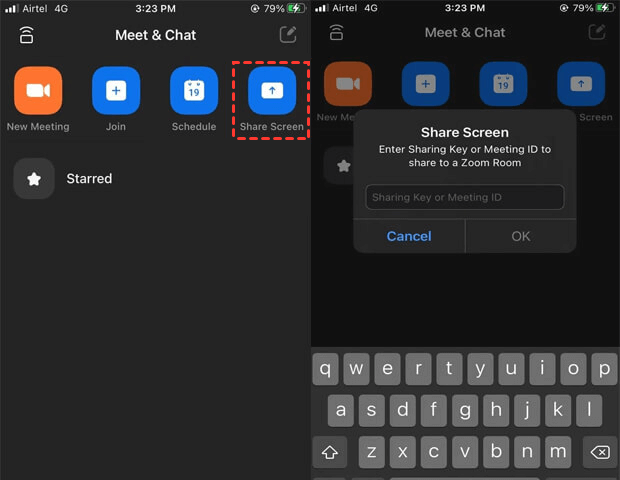 Option 2. ZoomZoom's popularity stems from its versatile video calling features, which also encompass screen sharing from an iPhone to another device during a video call with participants. As the meeting host, you retain the authority to grant screen sharing permissions to yourself or other participants. Step 1. Download and install Zoom on your iPhone and control devices. Step 2. Log in to Zoom on your control device and host a meeting. Select “Share Screen”. Step 3. On your iPhone, sign in to Zoom and select "Share Screen". Enter the Share Key or Meeting ID. Enter your Share Key or Meeting ID, which you can access on the controlling device. Step 4. Now you can view iPhone screen remotely |