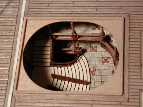 Qui abbiamo raccolto le foto significative che abbiamo scattato durante la manifestazione, per permettervi di fare un "giretto virtuale" a bordo di questa magnifica nave. Per darvi la proporzione di quello che vedrete, in questa prima pagina vi abbiamo voluto anticipare il mobili che sono contenuti al suo interno, in rapporto con una moneta da 100 lire. Altro particolare della scalone con l'orologio